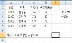 32. 아래 시트에서 키(Cm)가 170 이상인 사람의 수를 구하려고 한다. 다음 중 [E7] 셀에 입력할 수식으로 옳지 않은 것은 ?