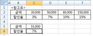 C3:F3 범위에서 C2:F2범위와 일치하는 열을 찾아 결과로 출력한다. (50,000과 열이 같은 7%를 출력)