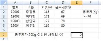 31. 다음 중 아래의 워크시트에서 몸무게가 70Kg 이상인 사람의 수를 구하고자 할 때 [E7] 셀에 입력할 수식으로 옳지 않은 것은?