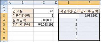 22. 다음 중 아래 그림과 같이 연 이율과 월 적금액이 고정되어 있고, 적금기간이 1년, 2년, 3년, 4년, 5년인 경우 각 만기 후의 금액을 확인하기 위한 도구로 적합한 것은?