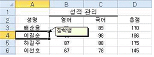 ④ [A4] 셀을 선택하고, 키보드의 <Back Space>키를 눌렀다. -> A4의 이길순 값이 삭제됨