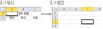 32. 새 워크시트에서 [A1] 셀에 셀 포인터를 두고, [개발 도구] 탭의 [상대 참조로 기록]을 선택한 후 [매크로 기록]을 클릭하여 [그림1]과 같이 데이터를 입력하는 ‘ 매크로1’을 작성하였다. 다음 중 [그림2]와 같이 [C3] 셀에 셀 포인터를 두고 ‘ 매크로1’을 실행한 경우 ‘성적 현황’이 입력되는 셀의 위치는?