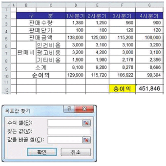21. 아래 워크시트에서 총이익[G12]이 500000이 되려면 4분기 판매수량[G3]이 얼마가 되어야 하는지 목표값 찾기를 이용하여 계산하고자 한다. 다음 중 [목표값 찾기] 대화상자에 입력할 내용이 순서대로 바르게 나열된 것은?
