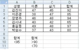 1. 합계가 95미만이면서 90초과의 값 : 92 , 94