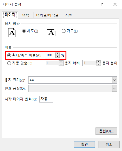 ③ 인쇄될 워크시트를 워크시트의 실제 크기의 백분율에 따라 확대ㆍ축소하려면 페이지 설정을 선택한다.
