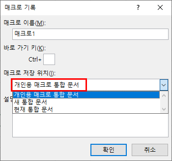 ③ 매크로 저장 위치: '개인용 매크로 통합 문서'를 선택하면 모든 Excel 문서에서 해당 매크로를 사용할 수 있다.