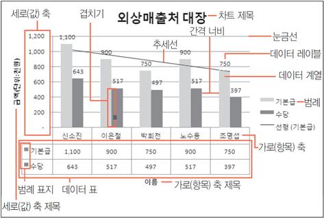 - 데이터 계열 : 차트로 표현할 값을 가진 선이나 막대로, 각 계열마다 다른 색이나 무늬를 가짐. 데이터 계열은 범례에 나타나는 내용과 일치함. 계열을 겹칠시 수치를 음수로 입력한 만큼 겹쳐진다.