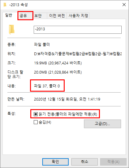 1. 다음 중 폴더의 [속성] 창에 대한 설명으로 옳지 않은 것은?