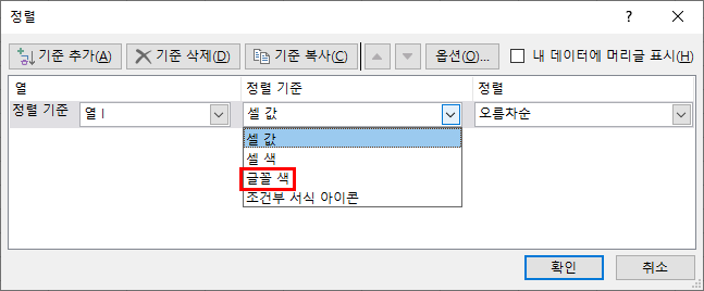 ② 글꼴 색을 기준으로 정렬할 수 있다.